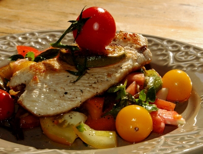 - To plate: Serve the turkey breast on a serving of salad. Top with a slice of caramelized lemon and the cherry tomato on the vine.Drizzle with the pan juices, a sprinkling of freshly milled pepper and to finish off, a last drizzling of olive oil.
