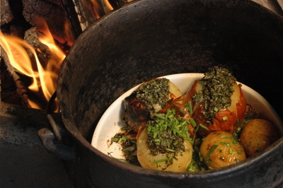 - Sautee the smaller tomatoes, the cherry tomatoes on the vine and the spring onions in some olive oil until warmed through and the tomatoes begin to burst. Keep the cherry tomatoes on the vine aside for decoration.