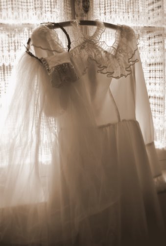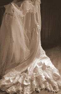 Persistant on designing her dress herself and having it made by a seamstress, she saw her dress show up unfinished and wore it on the day with some spots carefully held together by pins and quick hand stitching. But beautiful and dreamy it was and now it is waiting for a daughter or granddaughter or even a next generation who might someday just like it enough…