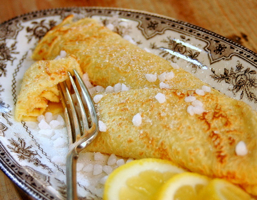 My husband’s favourite crêpe is sprinkled with softly flavoured cinnamon sugar, drizzled with lemon juice and rolled. He folds it double and whops it into his mouth, crunching on the still crackling sugar, while he starts sprinkling and rolling the next one.