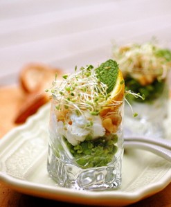 It is time for nature. For long walks. For the garden. Double digging and planting. For pruning and sowing. And for observing. After a hard winter, nature is on the verge of exploding into its exuberant spring plumage. To harmonize with the new growth and hope springing up all around, I wanted something green. Petits pois came to mind with its vibrant green . I call it a dip, but it is a spread, a paté, a guacamole, a tapenade too… I added Maroccan mint, some freshly sprouted seeds, soft goats cheese; it is early spring on a bruschetta. Nothing more can be said.