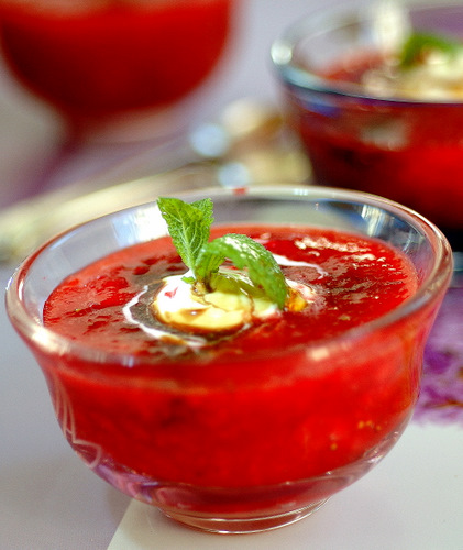 To accompany the ongoing saga of the soon-in-bloom-tulip, as well as the gardening folie that has me firmly in its hystyerical grip, I made a strawberry soup with the very first strawberries of the season. Not yet tasting of summer and sun though…! But who cares…! Using them in a summer/spring soup with added balsamic vinegar and handsfull of mint and pepper and rose water, is a great way to satisfy that ferocious desire for summer fruits.