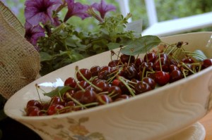 …cherries, freshly picked from a friends garden, a garden hat and pretty flower…