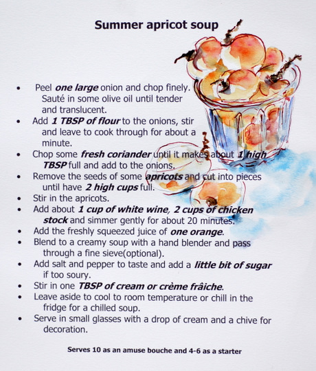 *Une petite soupe d’abricot est indispensable pour l’été. Sa couleur nous donne la chaleur des journées dorées. Dans son saveur on sent les ombres des rameaux d’un grand noyer et on a envie de s’allonger et fermer les yeux pour un petit moment magique. Et le goût…le goût nous donne l’impression d’entendre les cigales, de voir les guêpes qui dérangent la tranquilité d’un repas al fresco. Alors. Goûtons cette petite soupe et laissons notre imaginaire nous transporter vers un champ où on s’allonge dans l’herbe et nos pensées disparaissent dans les nuages de rêves et de bonheur.