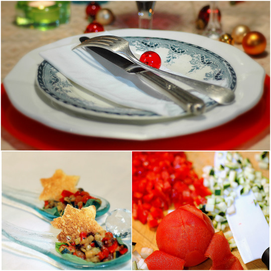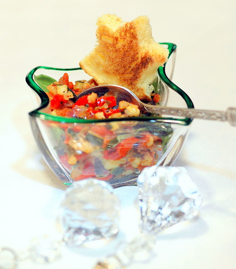 Ratatouille is such a versatile dish – there are more ways than can be counted to do it nowadays and everyone swears by his/her way. The traditional way takes takes far too long(for me in any case!) and the vegetables are too soft and juicy to my taste. So I do it the quicker and crunchier way and so far, nobody has complained…on the contrary…everybody finds it fresh and enjoys the crunchiness still present and the appearance pleasant. It is a perfect little vegetable starter for the festive meals that await us!