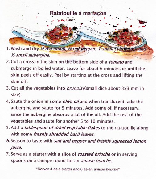 - Ratatouille can be used as a startert or an amuse bouche or as a side accompanying chicken, fish or red meat. If it is to accompany a meat dish, cut the dice a little bigger…perhaps 6×6 mm.