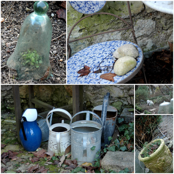 All things cold and wintry, with emtpy potager cloches and emtpy watering cans, a dry lemon verbena whcih awaits some sun to push its leaves and 2 pretty pebbles from La Loire to add some ambiance in this “jardin en Fevrier”.
