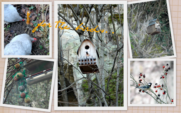 The rouge gorges et charbonnieres et mesanges charbonnieres feed happily on the fruit balls and seed bowl hanging under the arch and the chickens enjoy the freshly turned over soil.