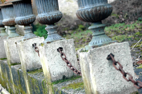 A lot of green moss on the terrace and stairs and around pots, while the rustic old chains that my husband so patiently aged for me, just gains more charm as the winter turns into spring.