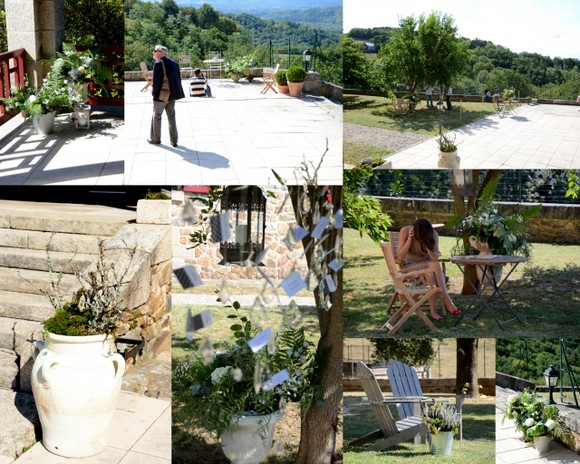 ..table decorations: moss and ferns and foliage from our forest at Coin Perdu; hydrangeas and grey foliage from the garden with accents of chardon and Chrysanthemum and camomiles among lanterns and some silver for sparkle.