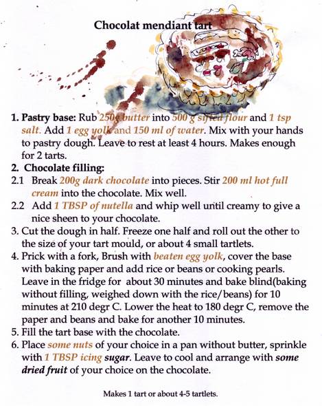 I am very rarely inspired by a recipe. It almost never happens happens that I eat something great and I want the recipe. Of course I enjoy it, but my true inspiration to create a recipe comes from “things” of everyday life. At the moment I am inspired by colour. Every day as I watch nature, I witness colours deepen and darken, fade and disappear. I am mesmerized by the dark of wet wood.. the doors, the windows, the wood piles along the country roads ready for winter fires, the deep beiges of dry fields, the soft creams of the sheep grazing the green hills..and then I remember that recipe saw in a magazine, or the one I tasted at a friends home, and I’m inspired to create the same. This time – A chocolate mendiant tart I saw in a magazine at the hairdresser. I can’t remember the magazine, or theexact ingredients, except for the addition of the Nutella and the icing sugar roasted nuts. And yes, the chocolate colour perfect to accompany the browns I see around me. And the taste..perfect for the cold rainy days..or any other day!