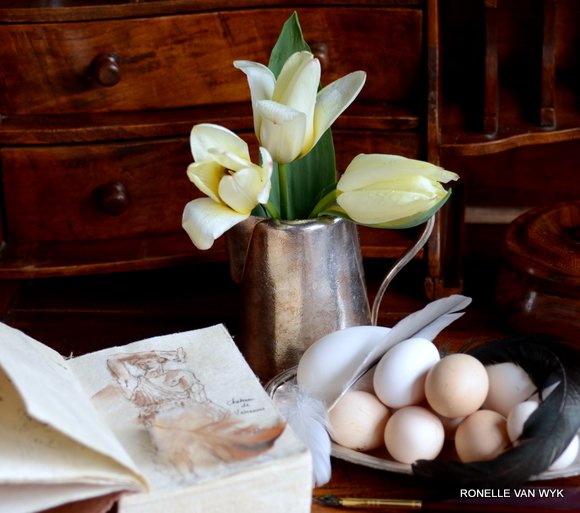 ..tulips in hotelsilver, my ink drawing book, a feather pen, feathers from the poullaillier and …some eggs!..