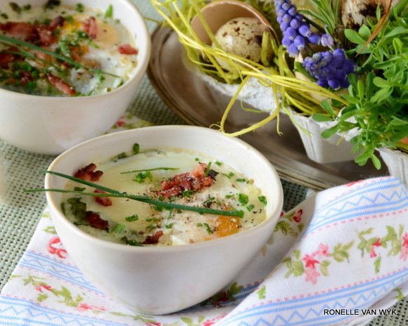 - Remove from the oven and sprinkle with salt and pepper, some fried bacon pieces and chopped chives. Serve immediately with toasted bread fingers to dip into the eggs.