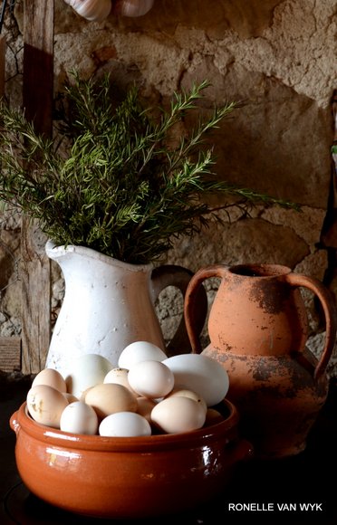 ..Eggs from the poulaillier, rosemary and terracotta in which the eggs end up when stolen from the poullaillier…a winning combination for me..