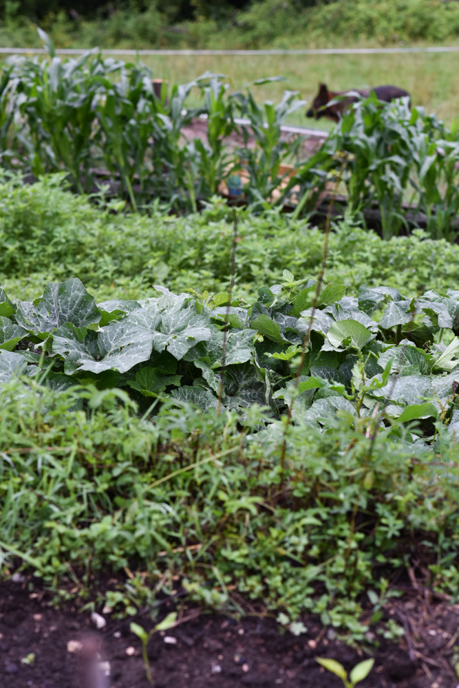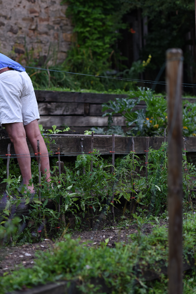 Our potager is my husband’s kingdom. A potager is a lot of work and maintenance, so every morning he is out there, cleaning, planting, weeding or just paying attention. We have had some good rains lately, so the potager is green and lush and looking good, which means the weeds are looking good too. The following photos tell the story of life in a potager.