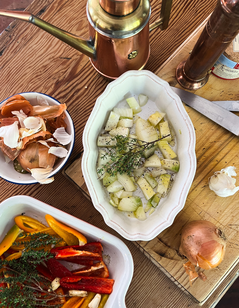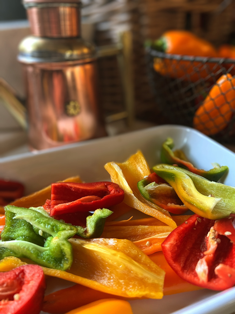 We still have sweet peppers in the potager and they are super sweet and colourful. This will probably be the last batch for this season. So I decided to make piperade which we love. I do it a bit different than the original way that comes from the southwest in France, particularly the Basque region. I make mine seperately in the oven and mix it all together at the last minute before serving. Its a bit less juicy and saucy and the flavors of all the ingredients harmonize without losing their individuality. We especially enjoy it on rustic toasted country bread for a lunch.