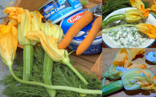 - OR make a batter of some flour and add some fizzy water, mix until a thick cream . Dip the courgette flowers wth filling into the batter until coated and deep fry quickly, one by one, turning each once once. Remove, drain and serve sprinkled with fleur de sel and a few drops of lemon juice, or a light yoghurt/mint sauce (natural yoghurt, chopped mint, seasoning, lemon juice..)Make your own filling by choosing ingredients you like and by mixing flavor which compliment each other. Keep it light.