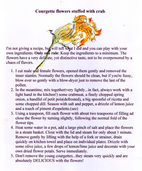 The female courgettes are the only ones carrying fruit and I’ve picked some of both to stuff with a crab filling. Both male and female flowers are edible. If ever you can get hold of some courgette flowers…they are absolutely divine, from another world and savored slowly and deliberately…well, I’m a lady, I can’t say what I really think, but you’ll know what I mean when once you’ve enjoyed one!