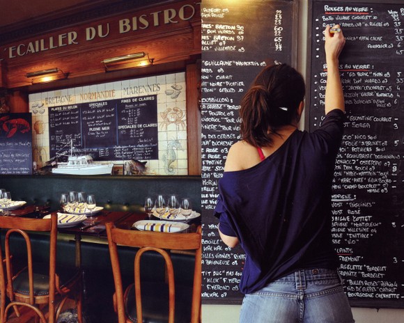 We depend on the chef of le bistro to entice us with le plat du jour, or better yet, le menu du jour, where we sit back with a carafe of house wine and wait for our entrée et plat, or plat et dessert. The menu for the day mostly consists of either a starter and main course OR main course and dessert. Of course written on the blackboard, since the menu of the day follows the season! So never trust a bistrot without a blackboard!