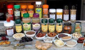 *Spices, nuts and seeds: Sesame seeds, pumpkin, sunflower, linseed, mustard(white and black), pine nuts, cumin seeds, badiane, fresh ginger, pistachios, walnuts, almonds, macadamia, black currents, dired raisins, prunes, dried apricots, dates, fennel seeds, dried tomato bits, dried cranberries, cinnamon, saffron, cardamom, different kinds of peppers, salts, paprika, curcuma, dried seaweed, garlic and herb salt and rosemary salts of Ina Paarman in SA…