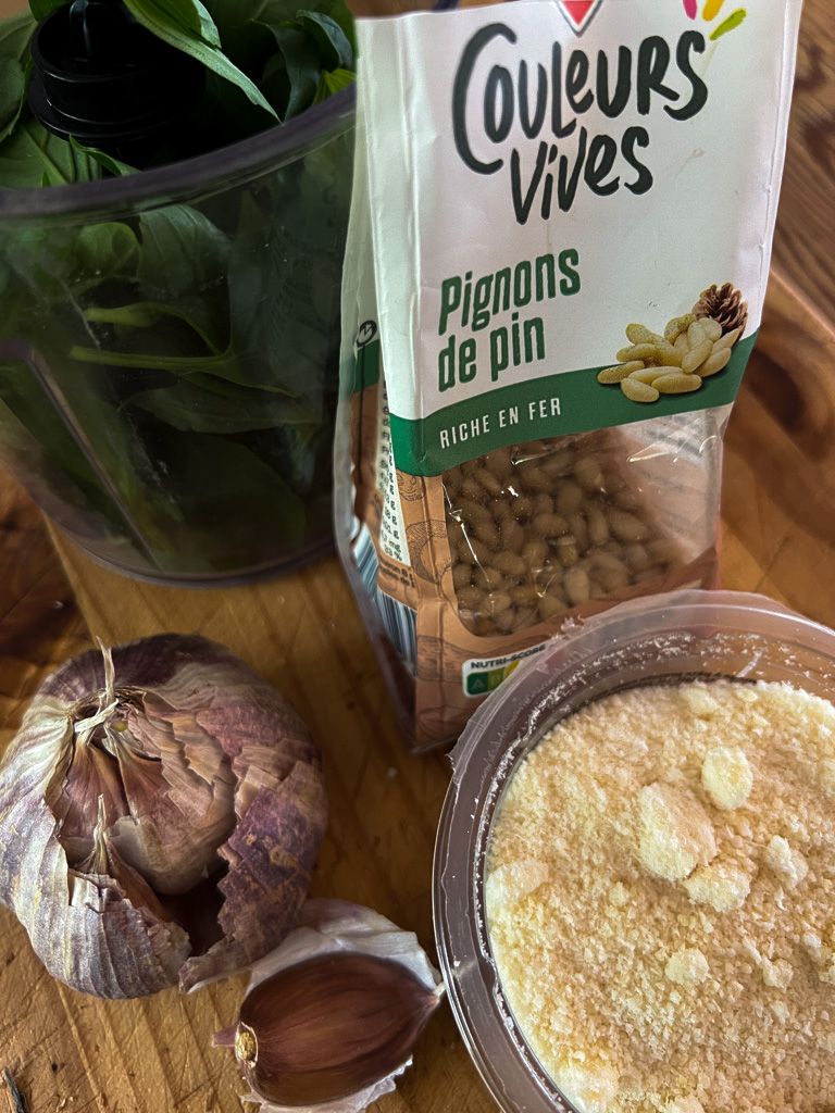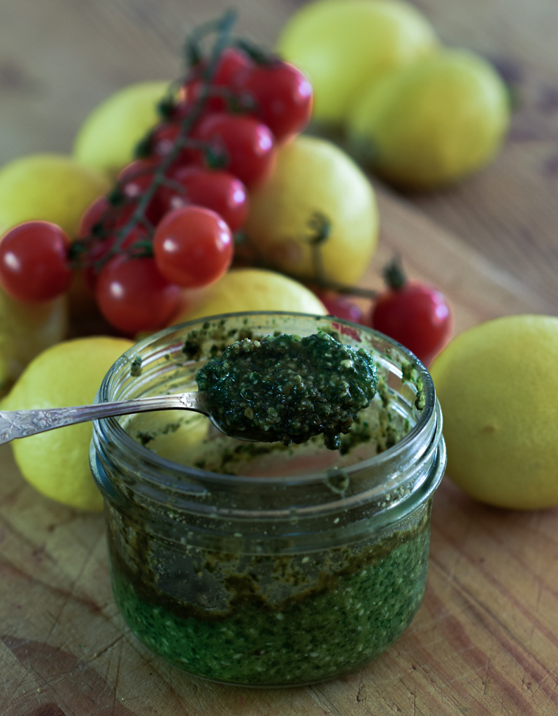 I absolutely adore pesto. But the storebought variety leaves me cold. So, once again I have to say that a homemade product is so much better then what you buy on a shelf in the supermarket. And speak of easy and quick. I make a big batch and keep it in the refrigerator for up to tow weeks. Just make sure you cover it with a layer of olive oil. It never lasts that long though. We use a lot of pesto ; with pasta, on sandwiches, on toasted pannis, with tomatoes and burrata, with salads, soups… just about eveywhere. This recipe makes about one cup of pesto.