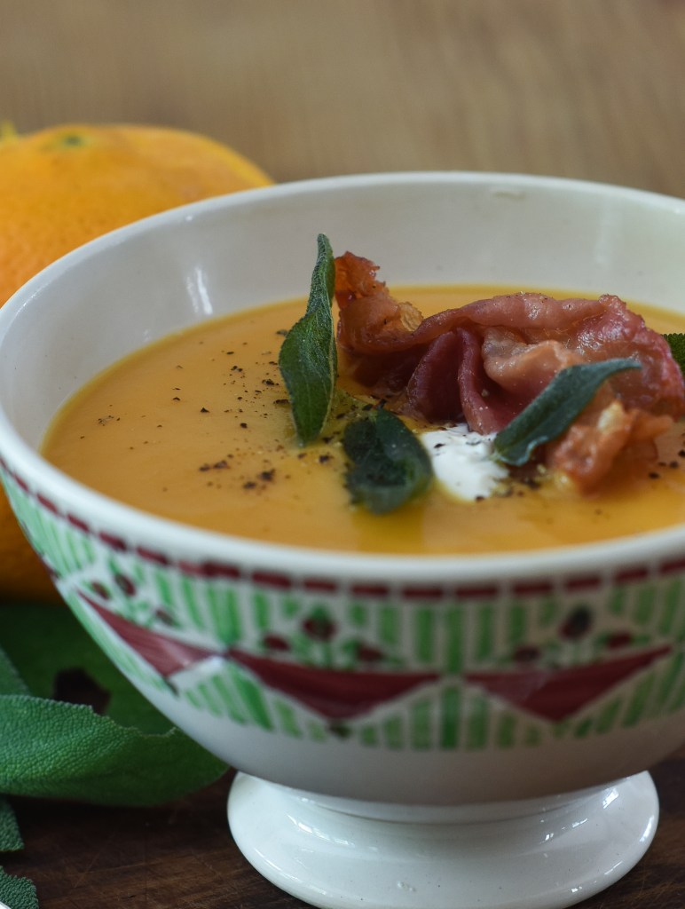 - Serve the soup in bowls and to with a dollop of créme fraîche, a slice of ham and some crispy sage leaves.